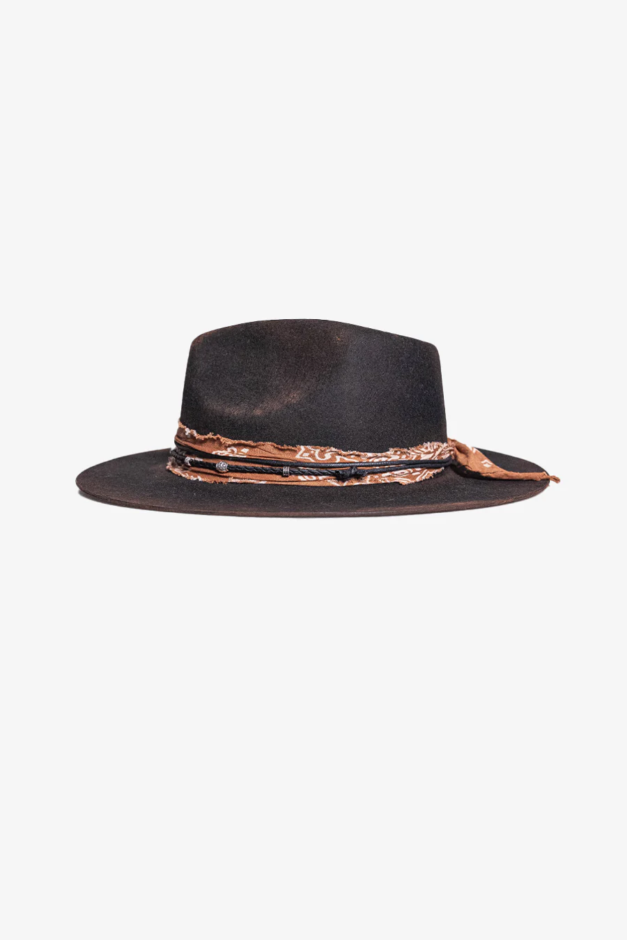 INTRODUCING THE CORNELL FEDORA, A CLASSIC FEDORA HAT HAND CRAFTED FROM 100% MERINO WOOL. THE HAT HAS BEEN CAREFULLY AGED & FINISHED WITH A BANDANA FOR A ROCK N ROLL TOUCH.