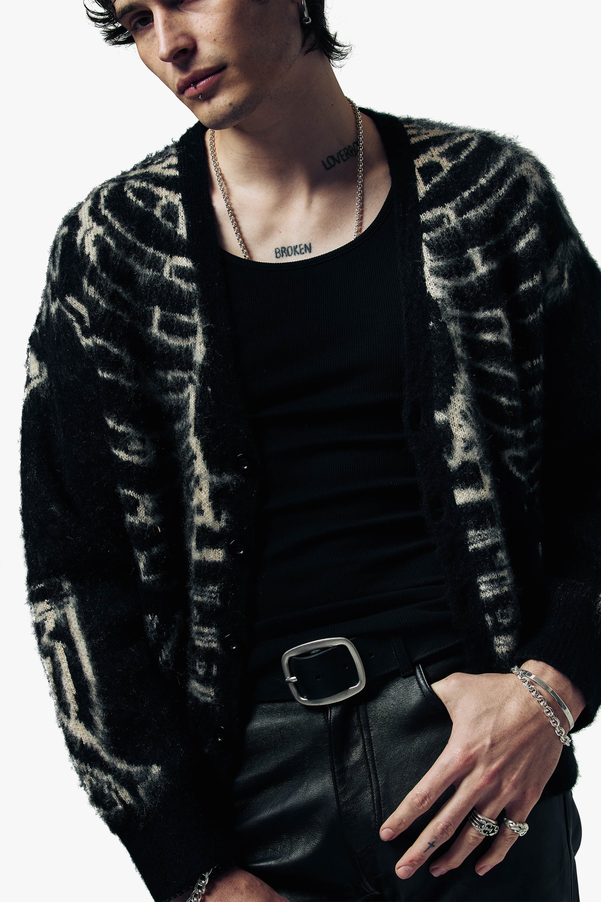 Crafted from a premium brushed wool and mohair blend, this oversized cardigan delivers a soft, luxurious feel with a rebellious edge. The faded skeleton graphic channels classic rock energy, while the ribbed placket, cuffs, and hem bring structure to its relaxed silhouette. Finished with front pockets for attitude and ease, a statement piece built for late nights, loud rooms, and life on the edge.